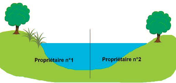 Lorsque la rivière traverse une propriété, son lit* appartient au propriétaire du terrain. Mais pas l’eau, car c’est une ressource vitale et universelle qui appartient à tous. Lorsque la rivière délimite deux propriétés, son lit* appartient pour moitié à chaque propriétaire.